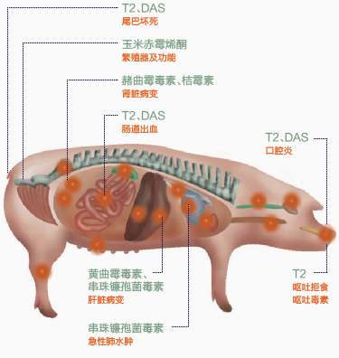 T-2毒素對(duì)豬禽的危害:T-2毒素由念珠球菌屬產(chǎn)生,直接損傷皮膚和粘膜。豬主要表現(xiàn)為厭食、嘔吐、生長(zhǎng)停滯、瘦弱、皮膚及粘膜壞死、胃腸機(jī)能紊亂、繁殖和神經(jīng)機(jī)能障礙,免疫機(jī)能降低。對(duì)家禽造成的影響:產(chǎn)蛋率降低,羽毛生長(zhǎng)不良,口腔潰瘍,采食量下降、拒食,神經(jīng)失調(diào),抑制免疫力。