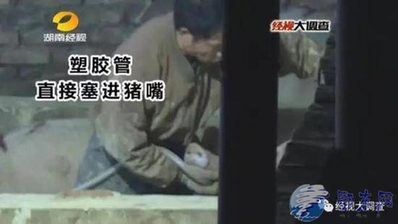 這里竟然是一個隱藏的灌豬增重的現(xiàn)場,這里一共有三名工人,一人負責拿管子往住嘴里塞,一人負責打開灌注的開關,另一人負責趕豬。
