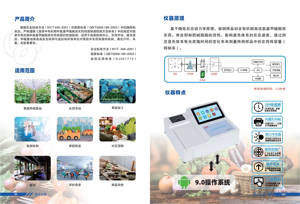 深芬儀器生產(chǎn)的安卓智能型農(nóng)藥殘留測定儀;是根據(jù)農(nóng)業(yè)標(biāo)準(zhǔn)方法(NY/T 448-2001)和國家標(biāo)準(zhǔn)(GB/T5009.199-2003)中的酶抑制率法,嚴(yán)格遵循《GB/T5009.199-2003蔬菜中有機(jī)磷和氨基甲酸酯類農(nóng)藥殘留快速檢測方法標(biāo)準(zhǔn)》中的規(guī)定對蔬菜中有機(jī)磷和氨基甲酸酯類農(nóng)藥殘留的快速檢測??蓮V泛應(yīng)用于各級蔬菜檢測中心、農(nóng)貿(mào)市場、超市、環(huán)保機(jī)構(gòu)、蔬菜種植基地、飯店、車載及實(shí)驗(yàn)室等食品安全檢測與監(jiān)控場所等單位對果蔬中農(nóng)藥殘留的檢測。農(nóng)藥殘留測定儀能準(zhǔn)確、快速檢測出蔬菜、水果、糧食、茶葉以及土壤中有機(jī)磷和氨基甲酸脂類農(nóng)藥殘留的快速檢測。